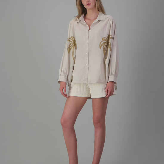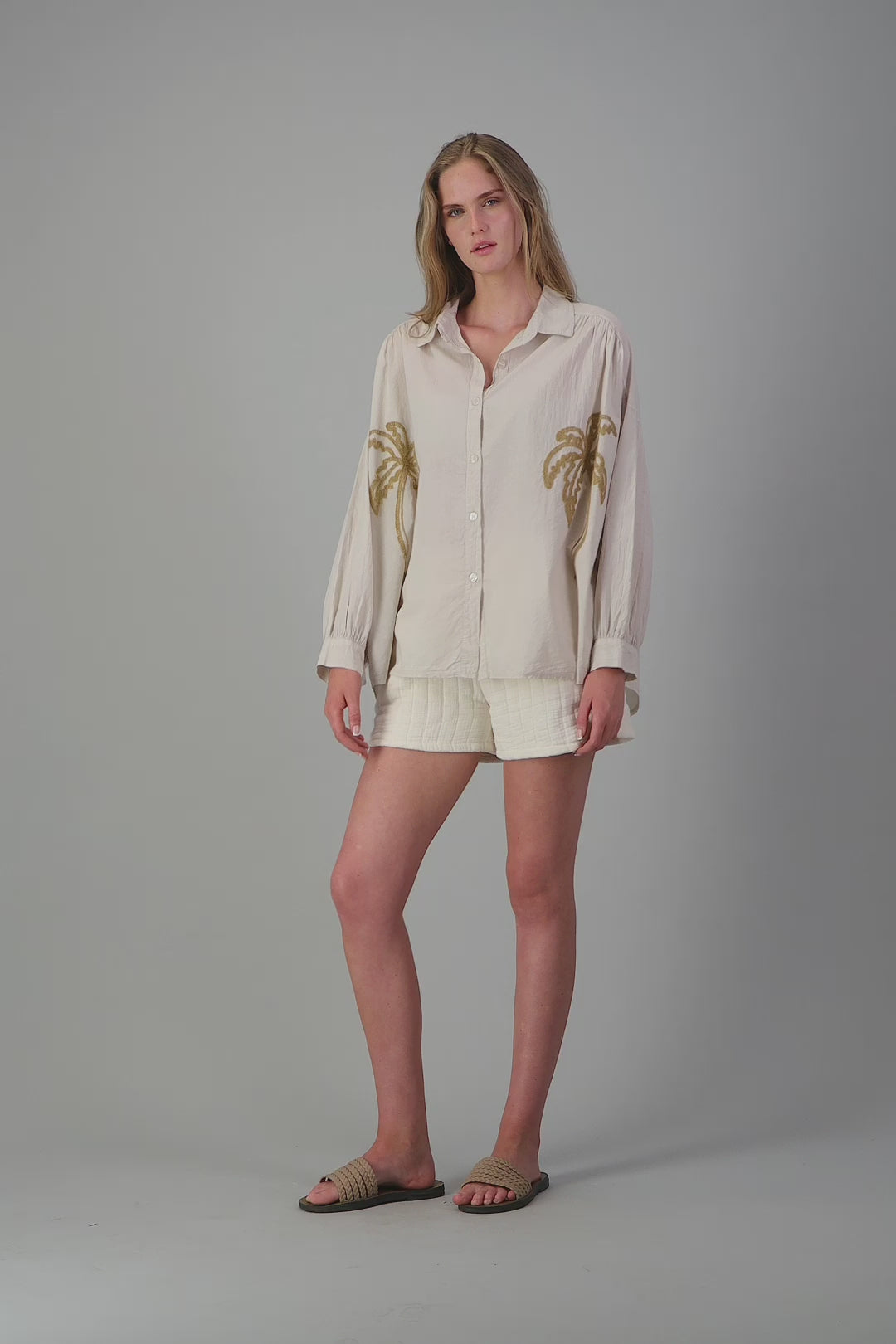 COTTON VOILE BUTTON DOWN SHIRT WITH GATHERED BACK AND PALM TREE EMBROIDERED DETAIL