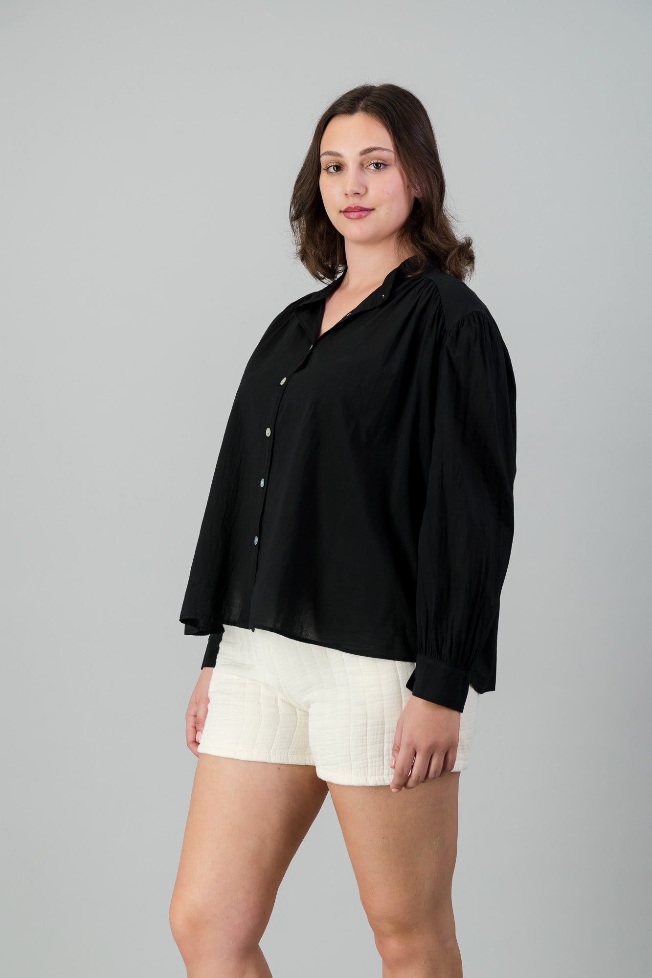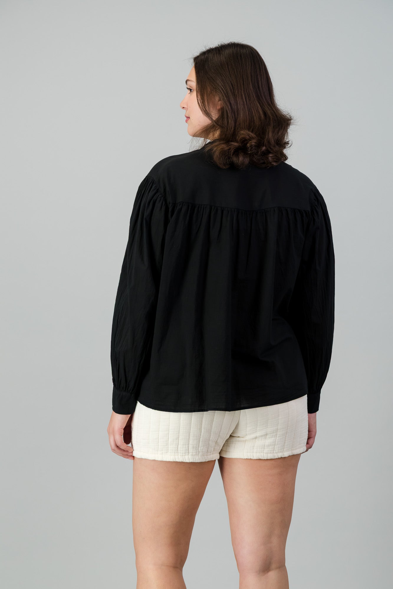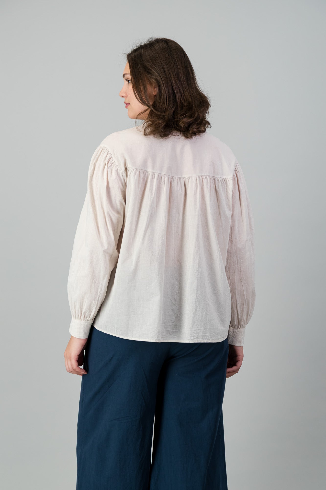 COTTON VOILE SHIRT WITH GATHERED BACK AND SHOULDER WITH MANDARIN COLLAR