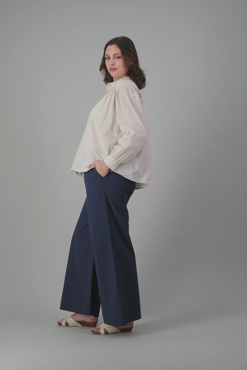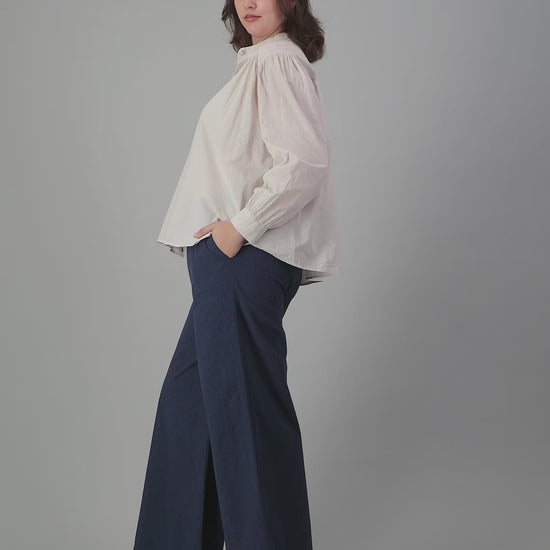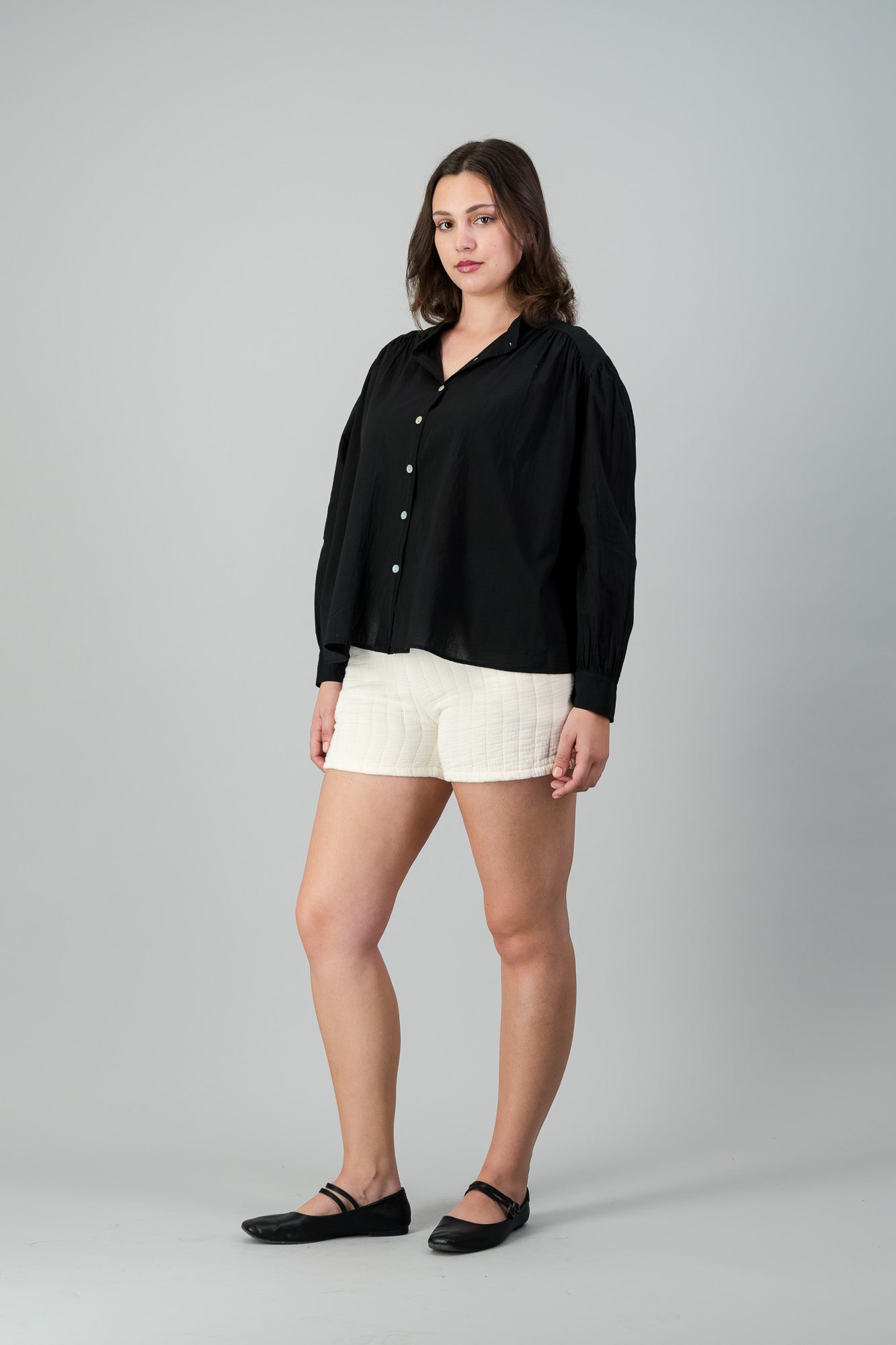 COTTON VOILE SHIRT WITH GATHERED BACK AND SHOULDER WITH MANDARIN COLLAR