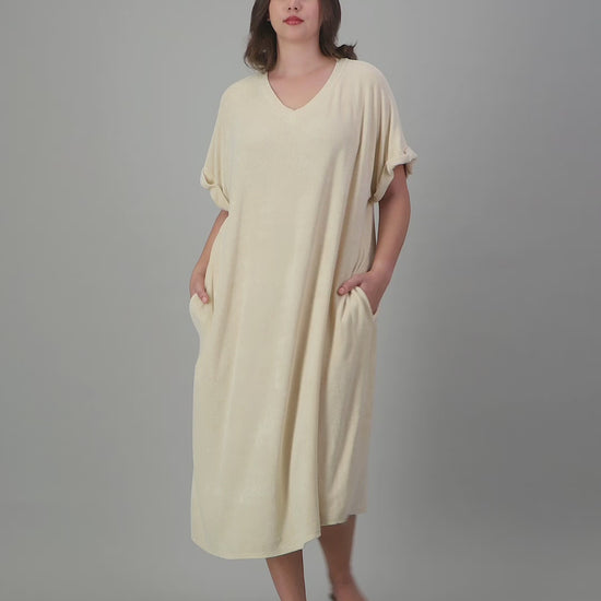 OVERSIZED SHIRT DRESS IN TOWELLING WITH POCKETS AND ROLLED SLEEVE DETAIL